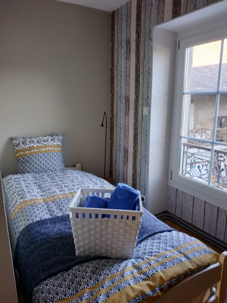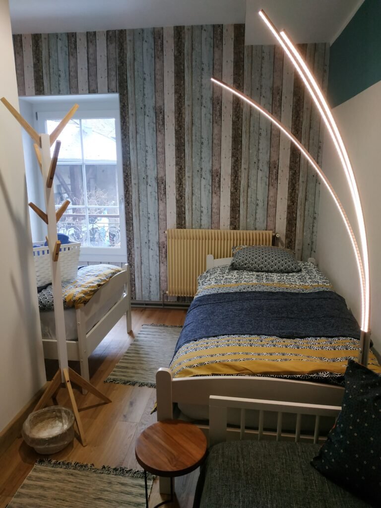 La petite chambre côté rue est orientée Est et dispose de 3 lits (2 lits de 90×200 et 1 lit de 70×160). La fenêtre côté rue est en triple vitrage et celle côté jardin en double vitrage.